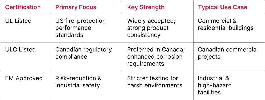 UL, ULC, and FM are the primary independent certification bodies governing safety and performance in the fire-protection industry. Their standards ensure that fire-sprinkler pipe meets strict requirements for pressure performance, weld integrity, coating durability, dimensional tolerances, and long-term reliability. These certifications serve as the compliance foundation for NFPA 13, and AHJs require them before approving any fire-sprinkler installation.